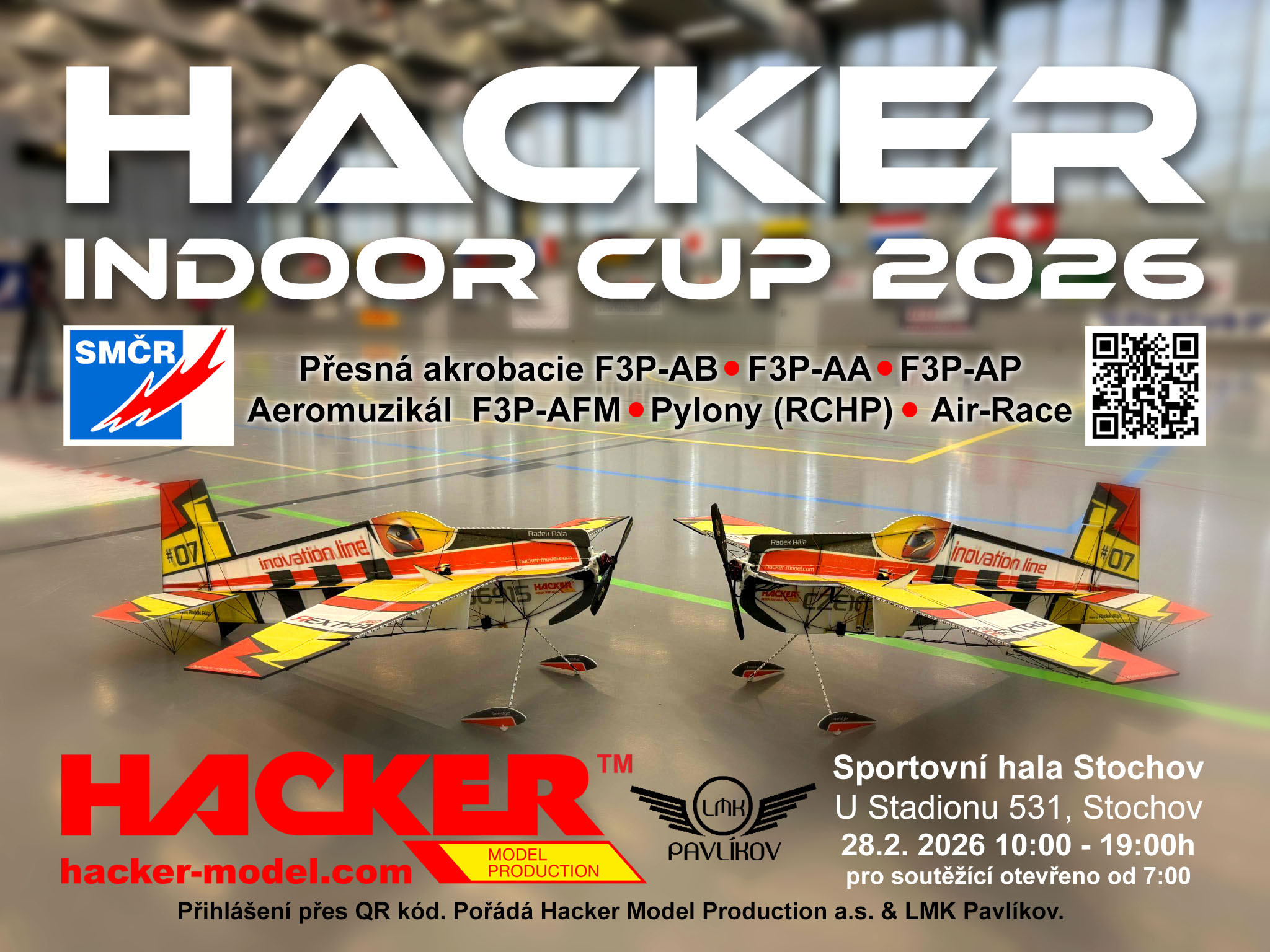 Společnost Hacker Model Productions a.s. a LMK Pavlíkov pořádají v termínu 28.2.2026 Hacker Indoor Cup 2026. Závody se uskuteční ve Sportovní hale Stochov, U Stadionu 531. V čase 10 – 19.00 hod. se představí soutěžící v několika halových kategoriích * přesná akrobacie * aeromuzikál * pylony * air-race.