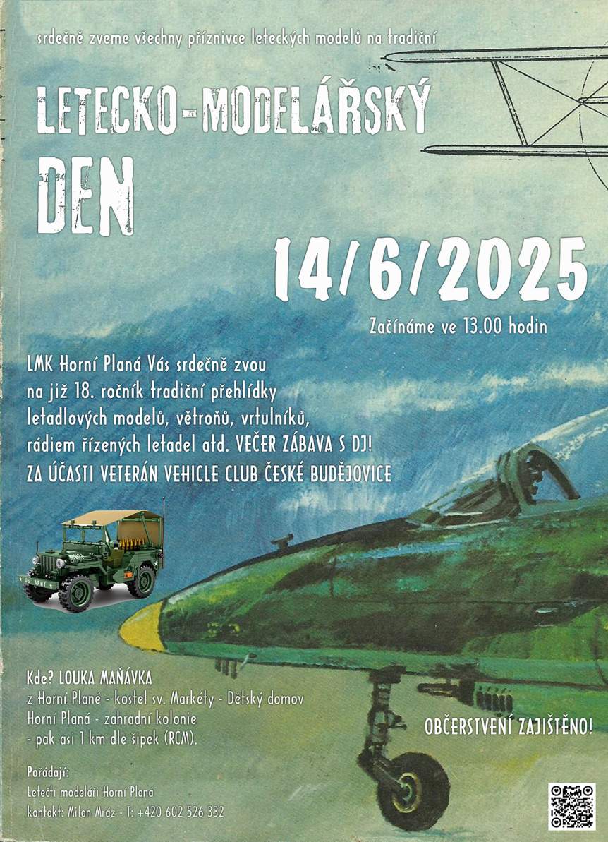 LMK Horní Planá pořádá v termínu 14.6.2025 od 13.00 hod. Letecko modelářský den. Místem konání akce je modelářské letiště LMK Horní Planá. Mimo přehlídky RC modelů různých měřítek si můžete prohlédnout i vozidla z dob minulých, které přiveze Veterán vehicle club České Budějovice.