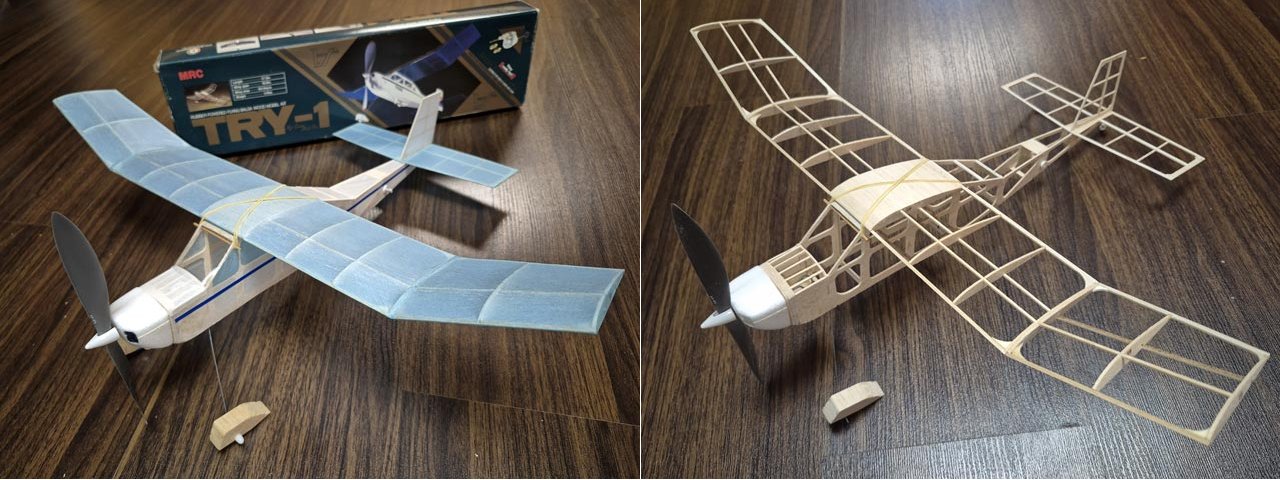 TRY-1 je název malého modelu s pohonem na gumu. Model má rozpětí 480 mm a váha se pohybuje cca 40 g. V plánku je použita převodovka 2,4:1 a 7″ vrtule, a gumový svazek 1/8″.