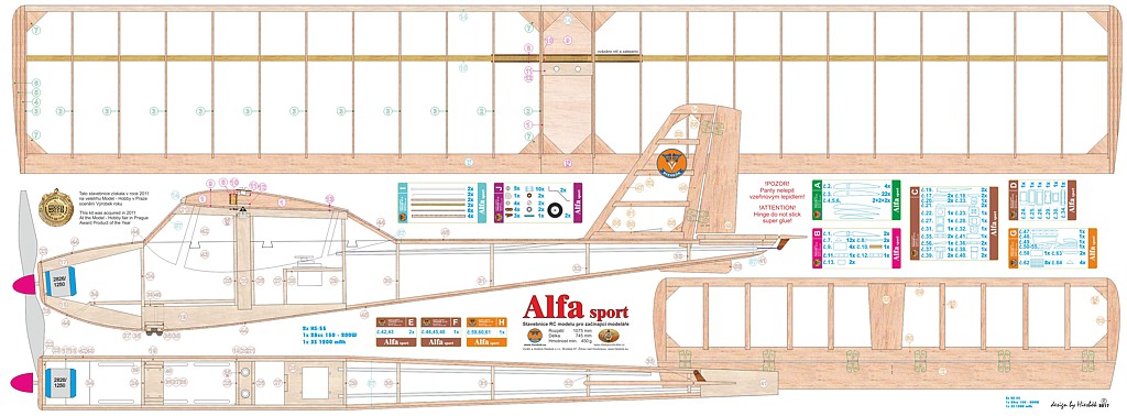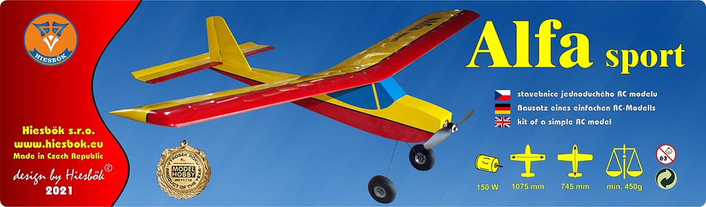 U české firmy Hiesbök najdete nespočet konstrukčních modelů letadel. A mezi ně patří i stavebnice školního RC hornoplošníku s názvem Alfa sport. Model má rozpětí 1075 mm a váhově se pohybuje kolem 450 – 550 g.